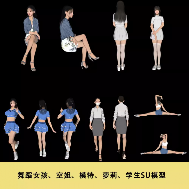 现代亚洲3D性感美女比基尼坐姿女人舞蹈模特萝莉女学生老师SU模型